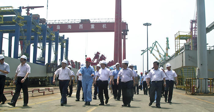 在海西重機總裝現(xiàn)場,張德平副市長實地考察了待批量發(fā)往黎巴嫩的岸橋和輪胎吊項目、發(fā)往馬來西亞的帶斗門機項目、發(fā)韓國鮮光新港的軌道吊項目及承制、調(diào)試的功能性海工平臺項目等。并聽取了海西重機董事長孫國慶關于企業(yè)上半年經(jīng)濟運行情況、轉(zhuǎn)型升級取得的成績以及在目前經(jīng)濟形勢下的合同承接情況。