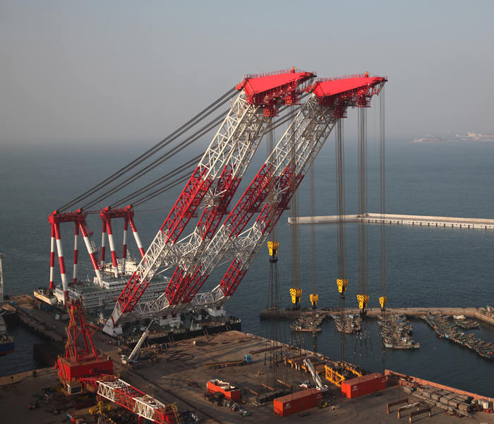 3600噸浮吊作為起重船核心技術(shù)之一,由海西重機(jī)自主研發(fā)、設(shè)計(jì)、制造和安裝,采用變幅式雙臂架結(jié)構(gòu),其起重重量為3600噸,最高起升高度110米,能更好地滿足橋梁吊裝施工的特點(diǎn),減小橋梁吊裝吊具結(jié)構(gòu),提高橋梁吊裝的有效高度,適用于沿海及近海的大型橋梁和設(shè)備的吊運(yùn)、安裝。
