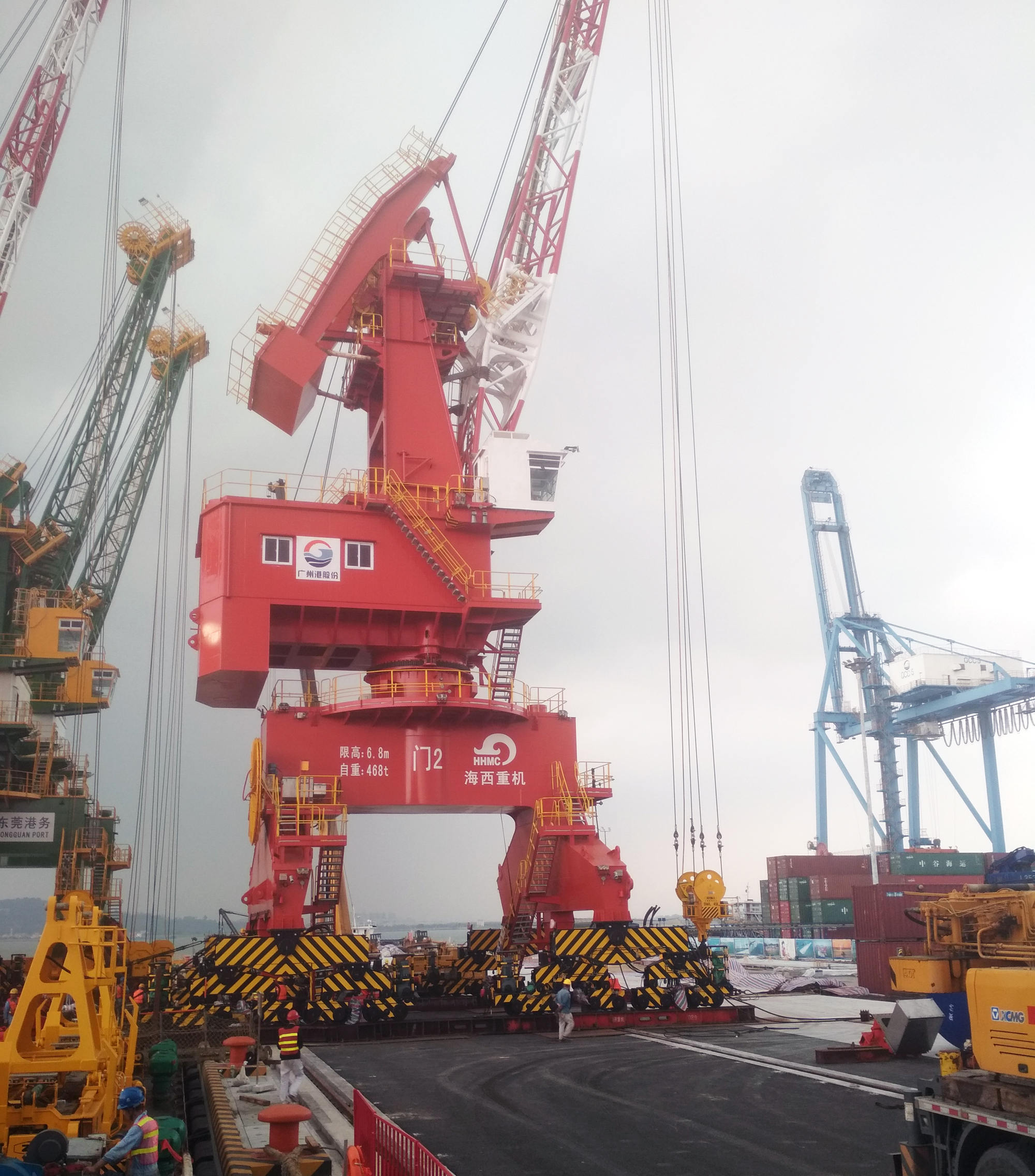 滿滿的一船門機(jī)。3月19日,我司分別為廣州港股份有限公司黃埔港務(wù)分公司、廣州港股份有限公司新沙港務(wù)有限公司、東莞市虎門港駁船碼頭有限公司制造的各2臺門機(jī)(共6臺)在海西重機(jī)的生產(chǎn)碼頭同船順利發(fā)運。3月26日,運輸船安全抵達(dá)黃埔港,一場卸船攻堅戰(zhàn)就此展開。