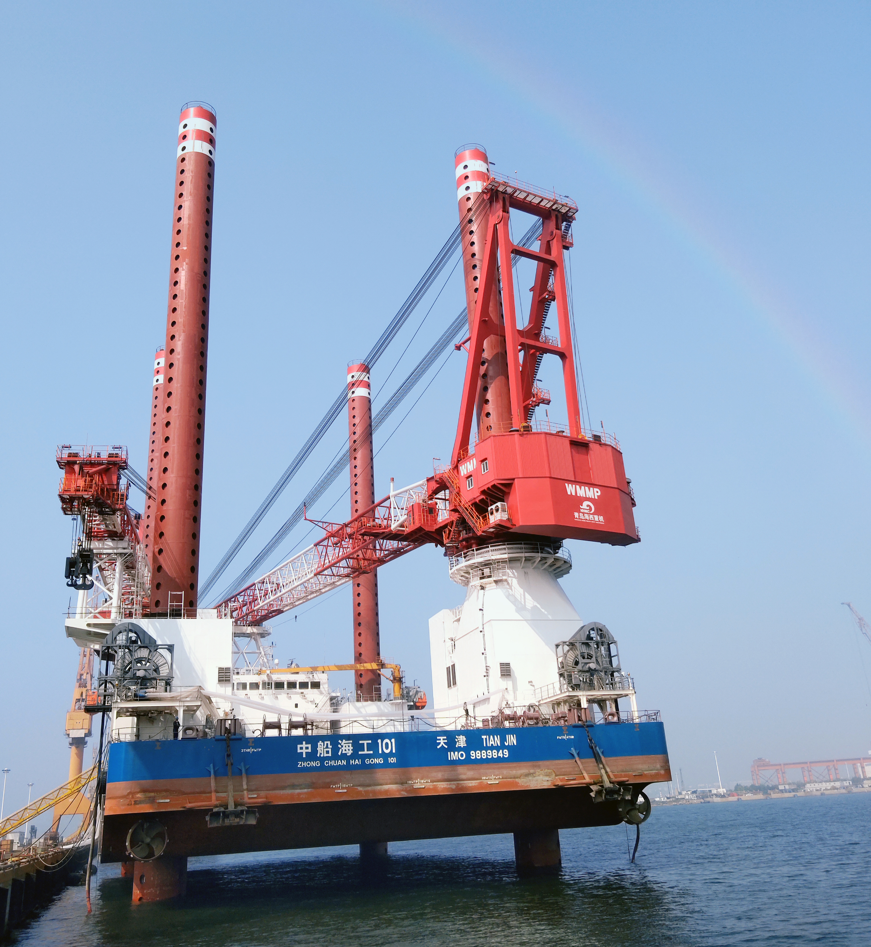 7月31日,大船集團山船重工為中船集團(天津)海上風電公司建造的自升式海上風電安裝平臺“中船海工101”順利交付。該平臺的關鍵設備350T和1000T繞樁吊(以下簡稱H15項目)由海西重機負責制造、安裝、調試。