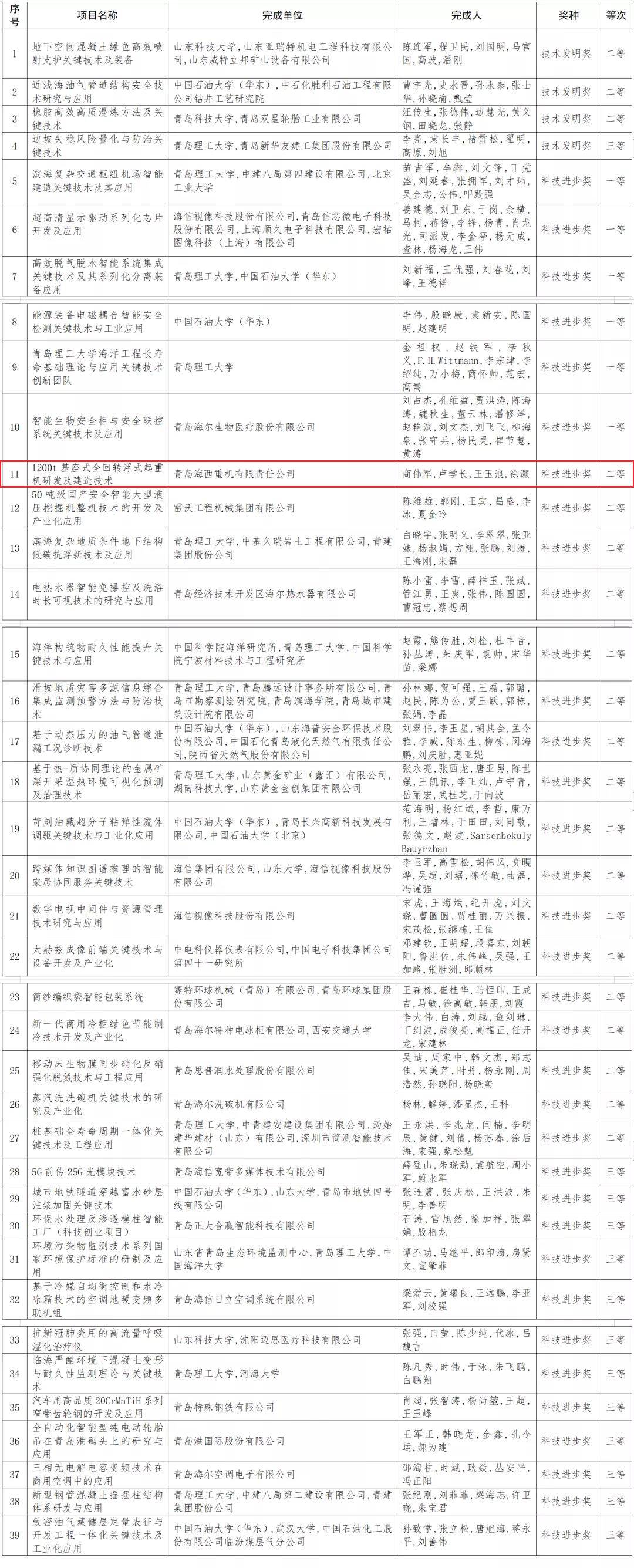 新區(qū)39項成果獲2020年度青島市科學技術(shù)獎!海西重機榮獲青島市科技進步二等獎