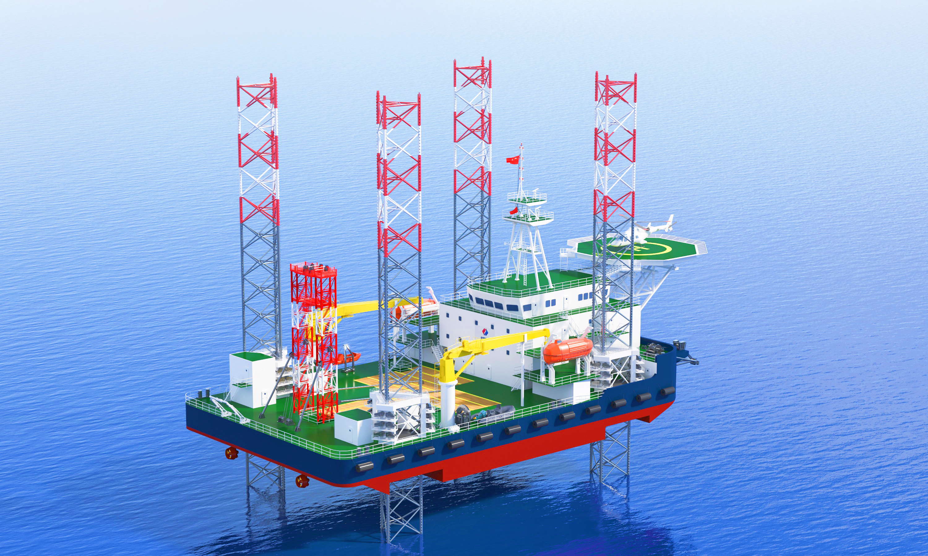 該平臺入級CCS,為鋼質(zhì)四樁腿自升式,采用電動齒輪齒條升降系統(tǒng),由平臺主體、樁腿(帶樁靴)、升降系統(tǒng)、推進系統(tǒng)、DP-1 動力定位系統(tǒng)、太陽能光伏、勘測試驗設(shè)備設(shè)施等部分組成。平臺樁腿全長約100米,最大作業(yè)水深75米,是國內(nèi)作業(yè)水深最深的勘測試驗平臺,主要用于海上工程勘測一體化作業(yè)及科研,包括鉆探、原位測試、物探、土工試驗等全作業(yè)流程。