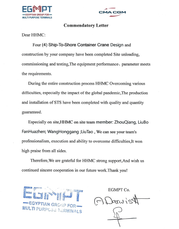 亞歷山大港多用途碼頭為埃及國家重點(diǎn)項(xiàng)目,埃及國家領(lǐng)導(dǎo)人員高度關(guān)注該項(xiàng)目進(jìn)展。岸橋到達(dá)用戶碼頭后,項(xiàng)目組嚴(yán)格按照策劃節(jié)點(diǎn)穩(wěn)步推進(jìn)每天工作,確保當(dāng)日事當(dāng)日畢,最終在整個(gè)項(xiàng)目組通力協(xié)作以及用戶的積極配合支持下,岸橋順利完成交付,并按計(jì)劃進(jìn)入保產(chǎn)。期間,埃及總理、交通部部長對海西重機(jī)產(chǎn)品及現(xiàn)場項(xiàng)目團(tuán)隊(duì)給予了充分肯定,多家當(dāng)?shù)孛襟w對此進(jìn)行了專題報(bào)道。用戶特地向我司發(fā)來一封表揚(yáng)信以示感謝。