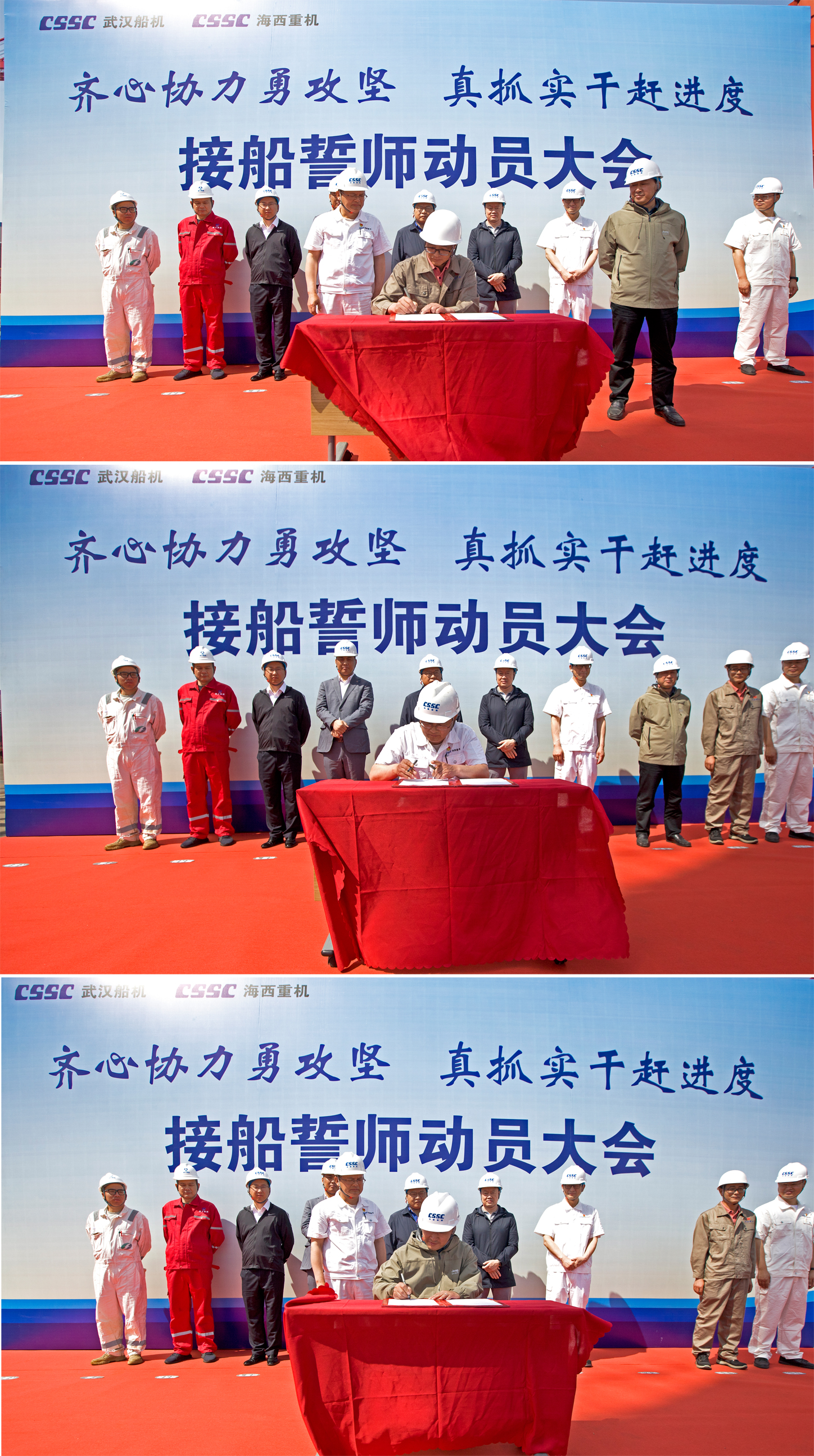 為了明確目標、凝聚共識、齊心協(xié)力、克難攻堅,亮明迎難而上的堅定信心和堅強決心,動員全員上下持續(xù)營造濃厚干事氛圍,掀起“齊心協(xié)力勇攻堅,真抓實干趕進度”的高潮,全力以赴打好海工項目集中攻堅戰(zhàn),5月25日上午,中國船舶集團旗下武漢船機海西重機公司在生產(chǎn)現(xiàn)場組織開展接船誓師動員大會。華夏金融租賃有限公司、北京神大集團有限公司、飛勵特船舶管理有限公司、大津重工泰州分公司、江陰雙馬重工裝備有限公司、武漢船機海西重機等相關(guān)方參加本次動員大會。