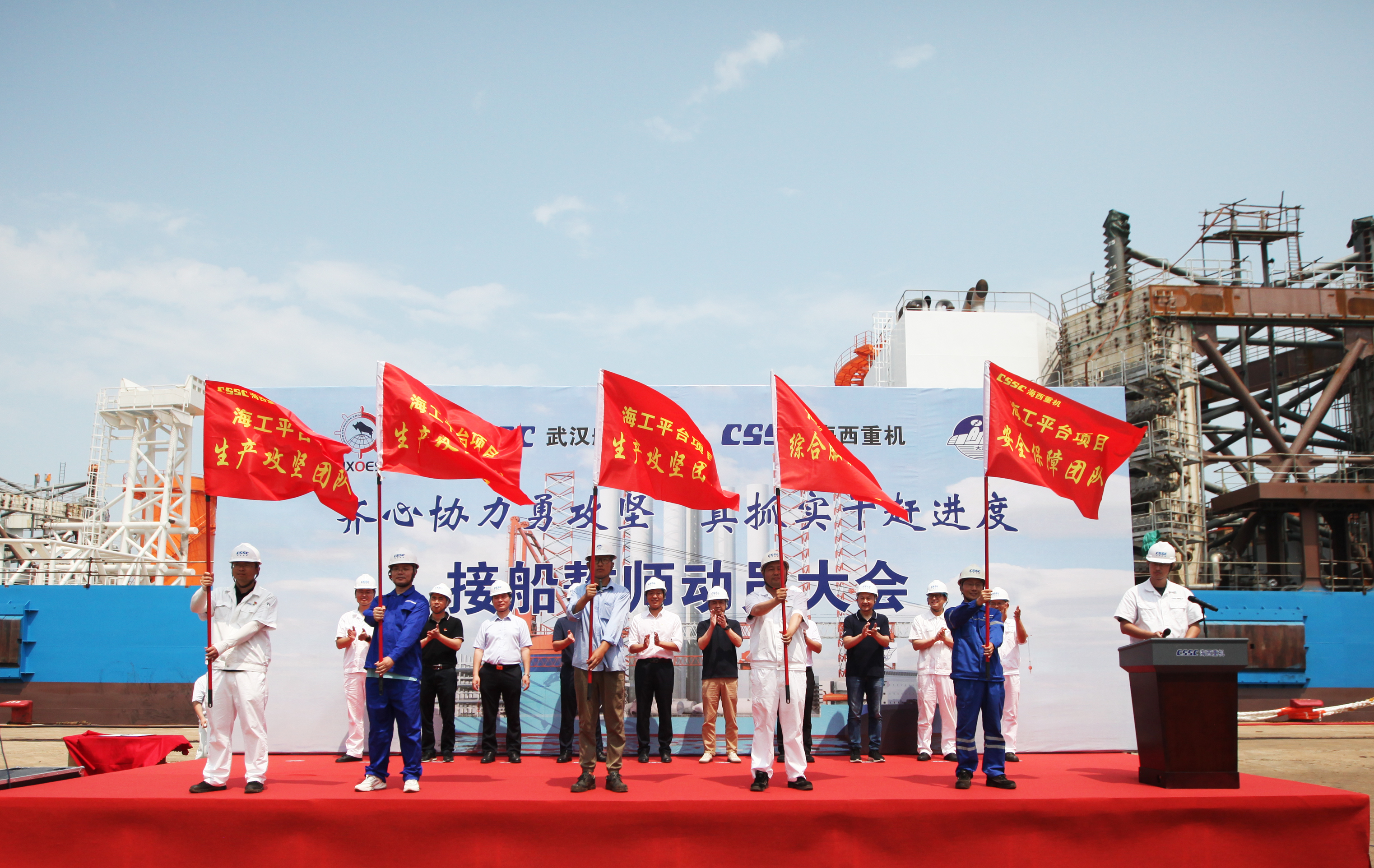動員就是號令、領旗就是領命,動員講話堅定了項目組的信心和決心,每一個項目參與人員將以豁得出的勇氣、善打硬仗的底氣、不畏艱難的膽氣和敢于擔當?shù)恼龤猓宰蛔〉木o迫感、慢不得的危機感、等不起的責任感,全力以赴抓好平臺項目各項任務落實落地,以實際行動打好華西海工1600T風電安裝平臺交付攻堅戰(zhàn)。