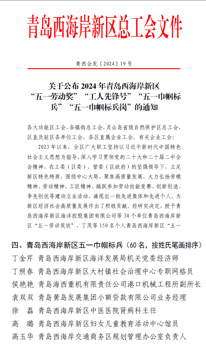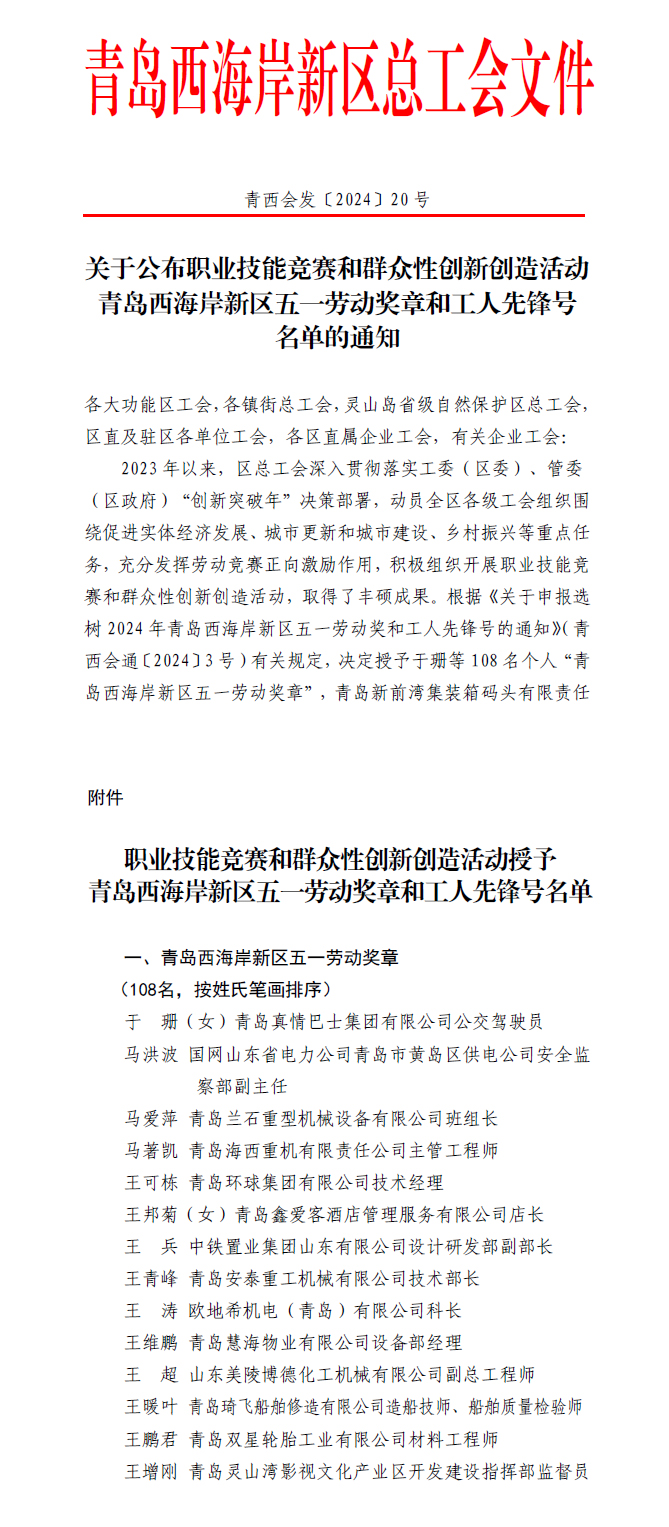 近日,青島西海岸新區(qū)總工會傳來喜訊,海西重機侯艷艷同志榮獲西海岸新區(qū)“五一巾幗標(biāo)兵”榮譽稱號。