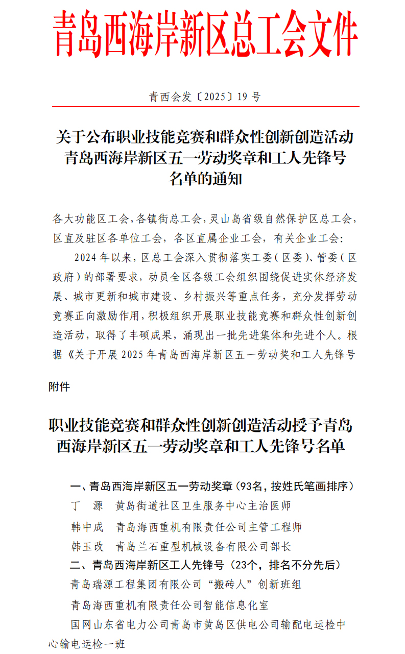 近日,海西重機智能信息化室榮獲西海岸新區(qū)“工人先鋒號”稱號,主管工程師韓中成榮獲西海岸新區(qū)“五一勞動獎章”。這一雙項殊榮的取得,既是對公司堅持創(chuàng)新驅動發(fā)展的認可,更是對新時代產業(yè)工人矢志技術報國的褒獎。