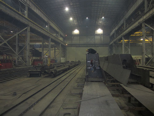 G126為一臺鹽城大豐港的集裝箱裝卸起重機,該項目13年1月初開工,5月底交付使用,中間要跨越春節(jié),工期異常緊張。為了確保該項目按期交貨,項目部、鋼構(gòu)部、工藝部、品質(zhì)部在項目開工前就進行了多次溝通,明確了生產(chǎn)任務(wù)。工藝部總結(jié)以往經(jīng)驗,并積極采納承制單位建議,優(yōu)化了制作工藝。品質(zhì)部在加強關(guān)鍵點控制的基礎(chǔ)上,明確、簡化了檢驗流程。鋼構(gòu)部按時間分割生產(chǎn)節(jié)點,嚴控人員及施工進度,制定了一系列的保障措施。目前G126項目開工僅半月時間,所有箱體結(jié)構(gòu)均已裝配成形,部分構(gòu)件如門框上橫梁已處于完工報檢階段,施工難度相對較大的前、后大梁已開始承軌梁裝配作業(yè)。施工進度基本處于計劃控制范圍。