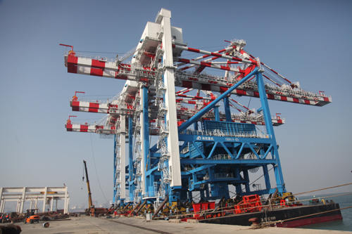 這次滾裝的三臺(tái)設(shè)備中,1500T/H卸船機(jī)是為華能(福建)海港公司研制的大型卸船機(jī)(共三臺(tái));兩臺(tái)MQ2535門機(jī)是為中國(guó)重要深水港口之一,西南部第一大港——廣西防城港生產(chǎn)的首批(共七臺(tái))門座起重機(jī)。這次三臺(tái)大型港機(jī)在同一天內(nèi)整機(jī)順利滾裝成功,再次驗(yàn)證了公司設(shè)計(jì)水平、制造工藝、組織能力和海綁捆扎工藝的成熟性,也標(biāo)志著武漢船機(jī)投資的青島海西重機(jī)經(jīng)過了近7年的從規(guī)劃、建設(shè)到邊建設(shè)、邊生產(chǎn)步入到成熟的批量化生產(chǎn)港口設(shè)備階段。為青島海西重機(jī)的最終目標(biāo):成為“中國(guó)最具競(jìng)爭(zhēng)力的港口裝備、設(shè)備企業(yè)”邁出了堅(jiān)實(shí)的一大步。