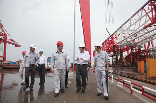 在參觀公司現(xiàn)場建成自用的1600噸龍門吊項(xiàng)目、正在吊裝上船的3600噸全回轉(zhuǎn)浮吊項(xiàng)目、面對公司的120米突堤碼頭以及繁忙的生產(chǎn)組裝現(xiàn)場,董總對公司的經(jīng)營發(fā)展態(tài)勢予以充分肯定。他說:在當(dāng)前市場經(jīng)濟(jì)低迷的形勢下,青島海西重機(jī)能夠抓住發(fā)展機(jī)遇,逆勢而上,尤其在技術(shù)創(chuàng)新和產(chǎn)品開發(fā)方面發(fā)揮了自身潛能,具有前瞻性和市場眼光,更是武漢船機(jī)公司在船市低迷的情況下,產(chǎn)品結(jié)構(gòu)調(diào)整的有力體現(xiàn)。董總特別對近期在煙臺、連云港、海南洋浦等港口項(xiàng)目投標(biāo)中,我司與上海振華同臺競標(biāo)并連續(xù)奪得標(biāo)的給予了高度肯定。